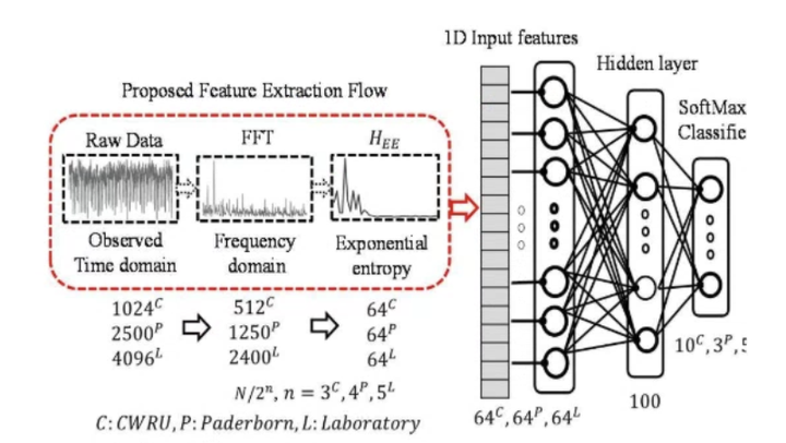 Rotating machinery is widely employed in various industries, including petroleum, automotive, food processing, etc. To facilitate the smooth rotational movement of various subcomponents, bearings are commonly employed in such machinery. However, due to factors such as fluctuating speeds, excessive loads, and prolonged periods of operation, bearings are susceptible to wear and degradation. To prevent bearing failures, enhance equipment reliability, and reduce maintenance costs, real-time monitoring and diagnostic techniques for bearings are essential. Predictive Maintenance (PdM) is a widely adopted strategy for ensuring consistent operational conditions of machinery by monitoring their health status through sensor data. However, the high diversity and massive volume of sensor data present significant challenges in the analysis of fault signals. To address this challenge, we propose an Exponential Power Entropy (EPE) based feature extraction method for extracting salient features from sensor data and feeding them to a Neural Network (NN) for further NN-based fault diagnosis. Additionally, we propose a Decision Threshold (DT) approach to enhance the prediction accuracy of the NN. These approaches not only ensure the quality of the fault diagnosis but also significantly reduce the computation time. In comparison to the traditional feature extraction method, the proposed EPE-based feature extraction method demonstrates an accuracy improvement from 2.8% to 28.7% and reduces the number of neurons by 54.5% to 94.7% in bearing fault diagnosis while reducing model complexity by 98.3% compared to traditional Deep Neural Network (DNN) approaches.